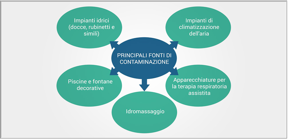 Le installazioni che producono acqua nebulizzata, come gli impianti di condizionamento, le reti di ricircolo acqua calda negli impianti idrico-sanitari, costituiscono dei siti favorevoli per la diffusione del batterio.